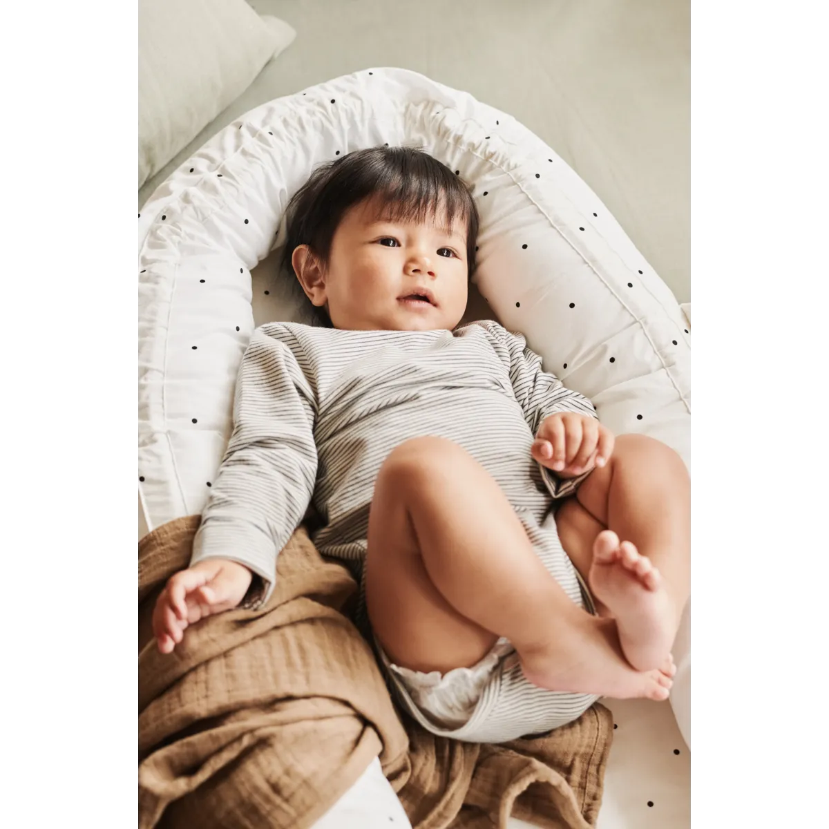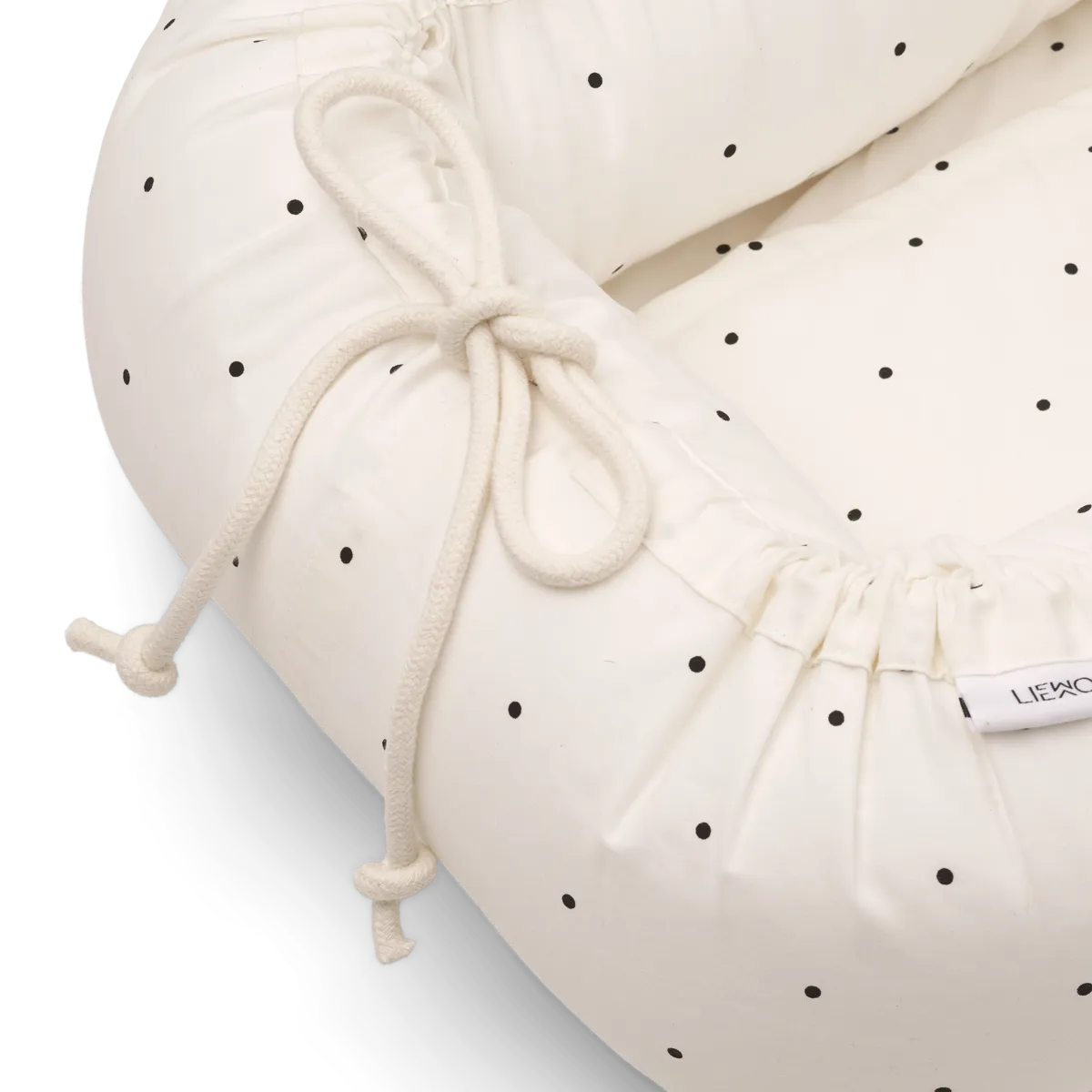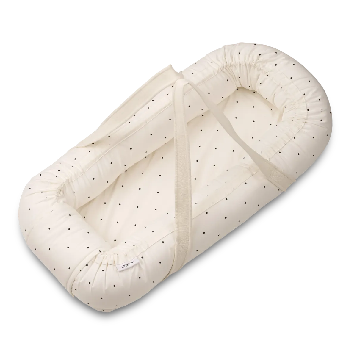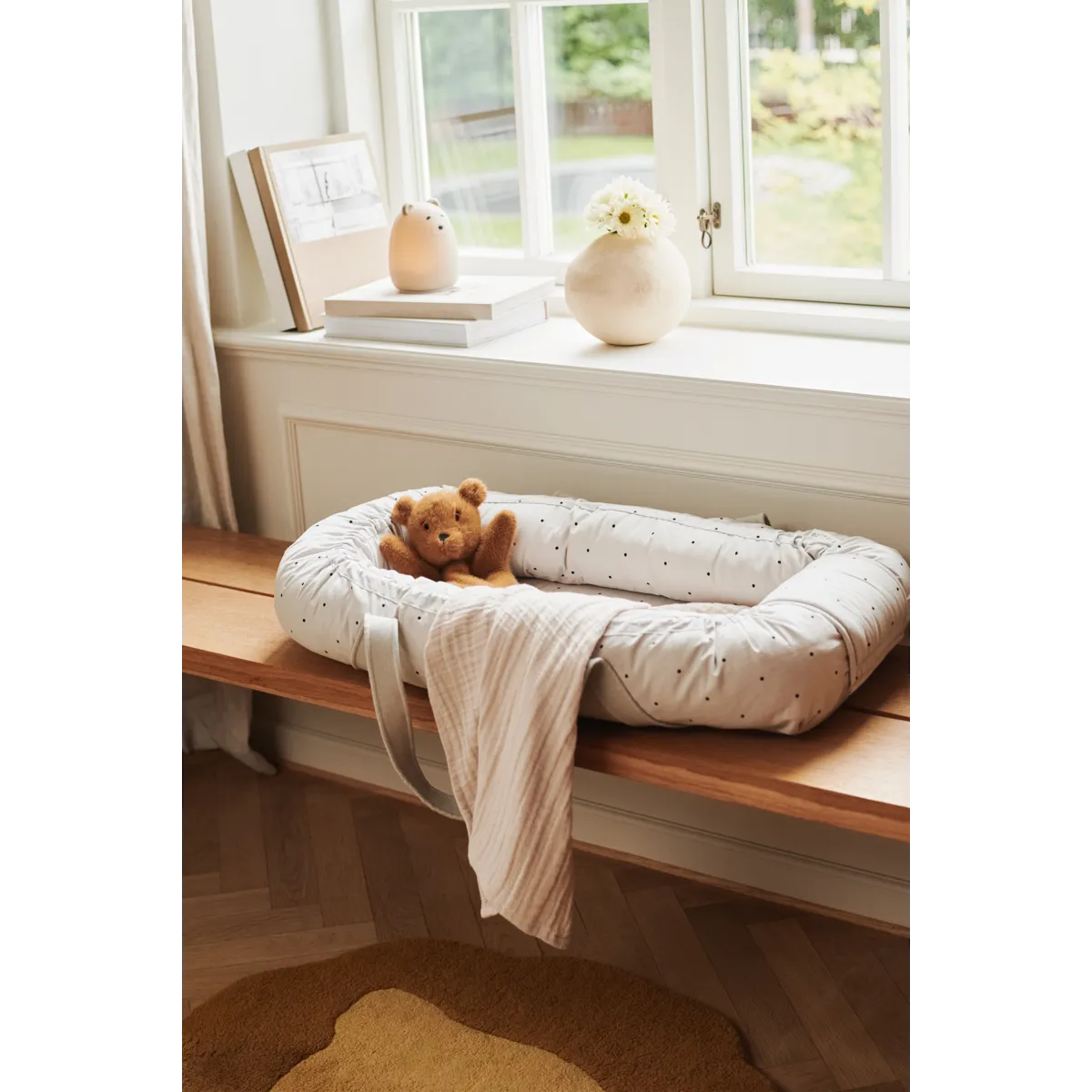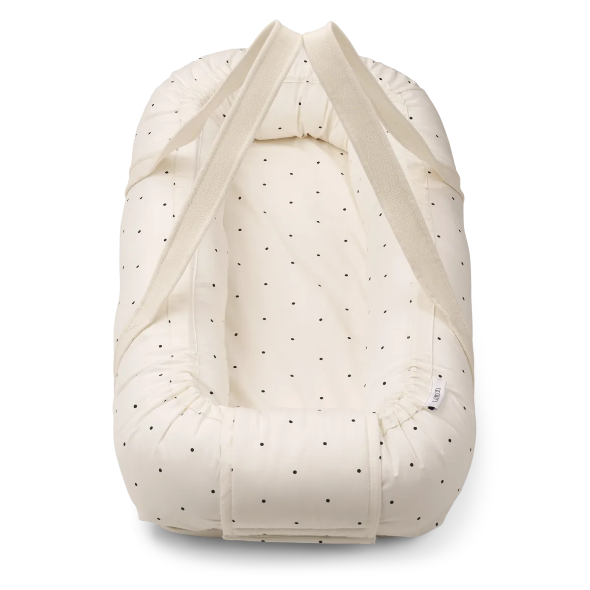 Tai tobula lizdelio ir nešyklės kombinacija, suteikianti mažyliui saugumo ir jaukumo jausmą tiek namuose, tiek kelionėje. Patogios rankenos leidžia lengvai pernešti mažylį iš kambario į kambarį ar įdėti į vežimėlį ar automobilį. Užvalkalas pagamintas iš itin švelnaus, 100 % organinės medvilnės audinio su žaismingais raštais, kurį galima nuimti ir išskalbti.