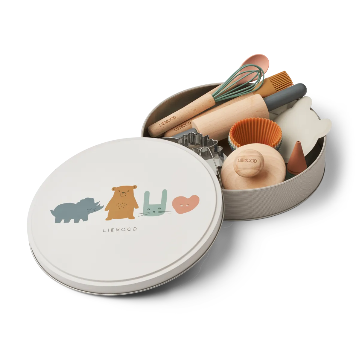 Paverskite šeimos kepimo laiką smagiu nuotykiu su kepimo rinkiniu! Šis funkcionalus ir žaismingas rinkinys supakuotas į stilingą skardinę dėžutę – joje mažieji kepėjai ras viską, ko reikia gardiems sausainiams ir keksiukams kurti.