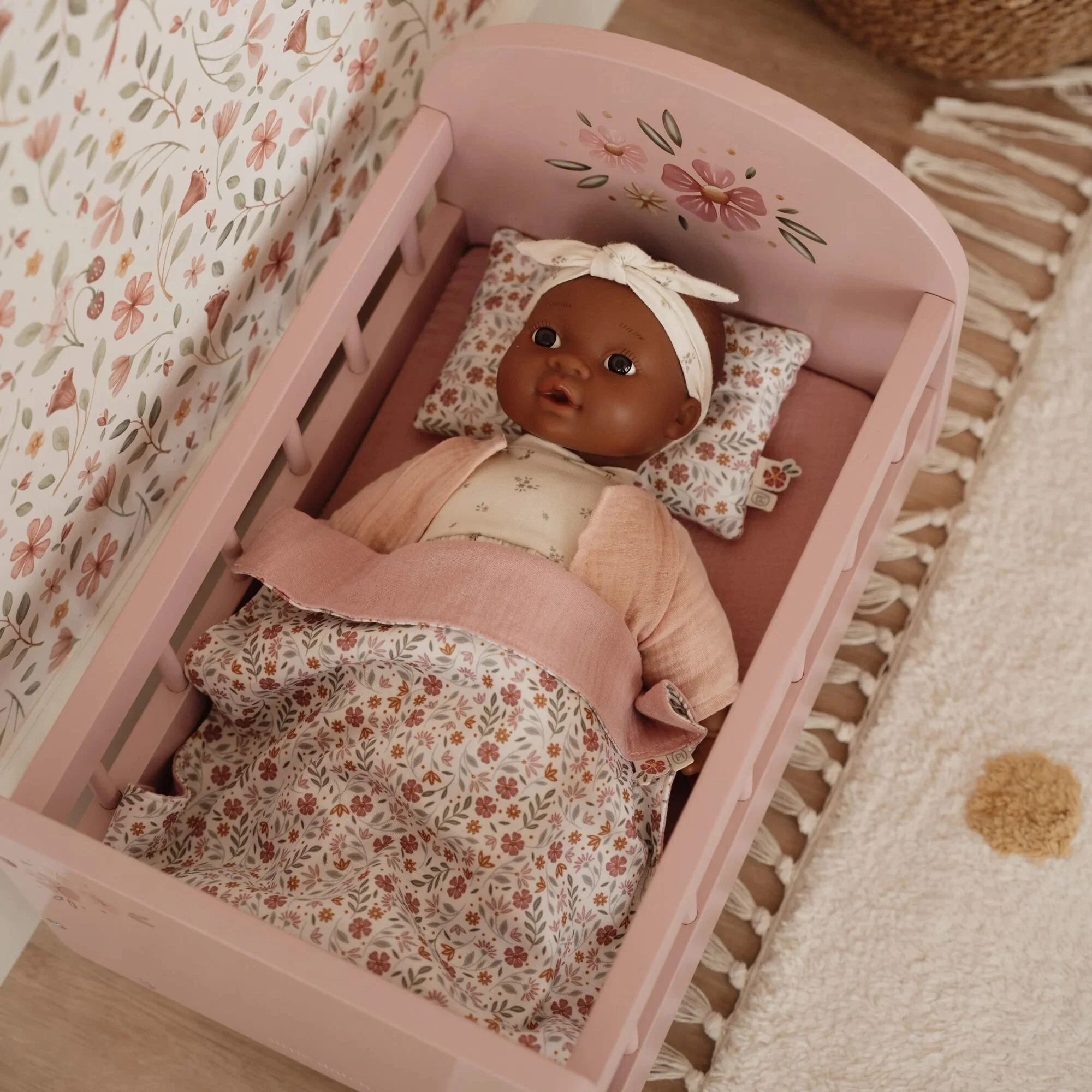Šioje dailioje medinėje lėlių lovytėje lėlytė miegos minkštai ir patogiai visą naktį. Lovytė komplektuojama su jaukia pagalvėle, šiltu apklotėliu ir minkštu čiužinuku, dekoruotais žaviu gėlių raštu. Švelnaus medžio spalvos kojelės ir elegantiška gėlių iliustracija suteikia lovytei romantišką, pasakišką išvaizdą. Tai puiki vietelė lėlei pailsėti po ilgos žaidimų dienos – o vaikams tai tampa nuostabiu vaidmenų žaidimu, padedančiu ugdyti rūpestingumą ir empatiją.